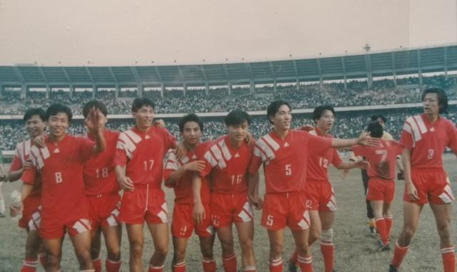 1994年甲B末轮,湖南金象队在贺龙体育场以3比1击败火车头队,队员们赛后庆祝保级成功。供图/程坚(符洹雨翻拍)