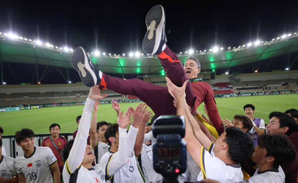 这是中国足球时隔22年之后再次打进洲际赛事的决赛,队员们激动地将主教练安东尼奥抛了起来,庆祝这场大捷。