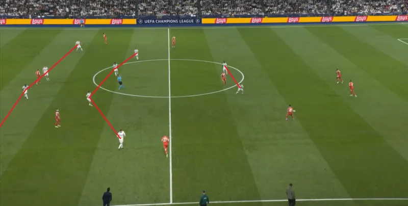 然而,上半场让人印象更为深刻的,并不是拜仁的进攻,反而是皇马的反击,他们每隔几分钟就能打出一次反击,从而在20分钟后,丢球之前,总计打出了三次不错的进攻: